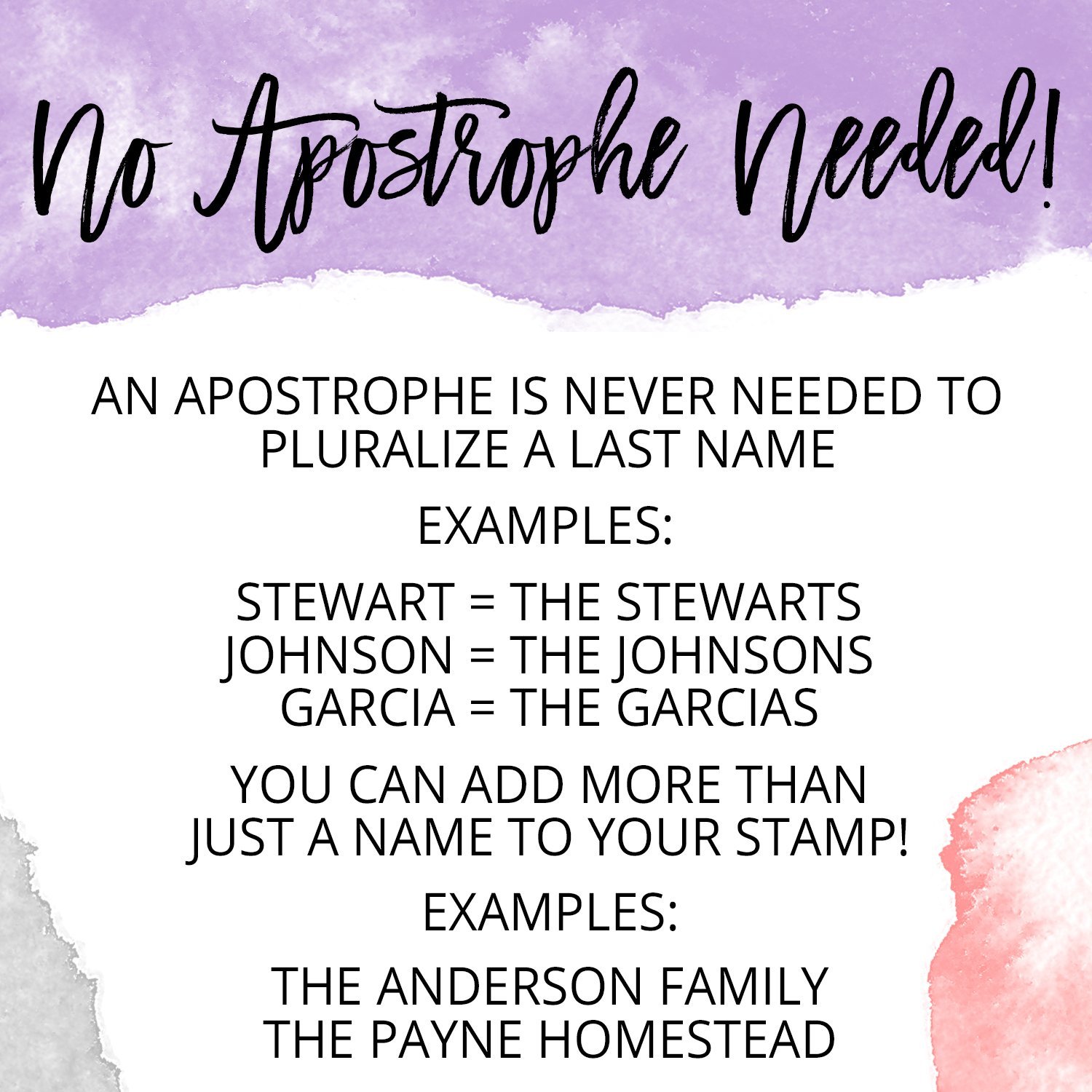 Your stamp comes filled with one premium ink color of your choice. Choose from black, red, blue, green, or violet (self-inking only).